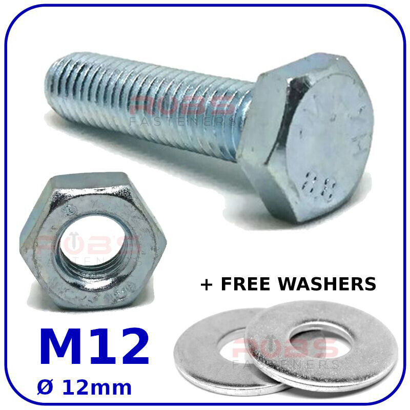 M12 (ø 12mm) SETSCREWS FULLY THREADED + NUTS & FREE WASHERS