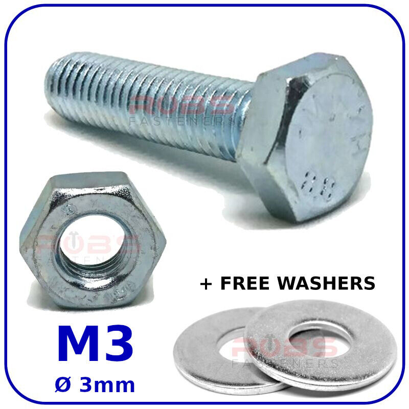 M3 (ø 3mm) SETSCREWS FULLY THREADED + NUTS & FREE WASHERS