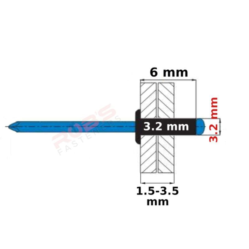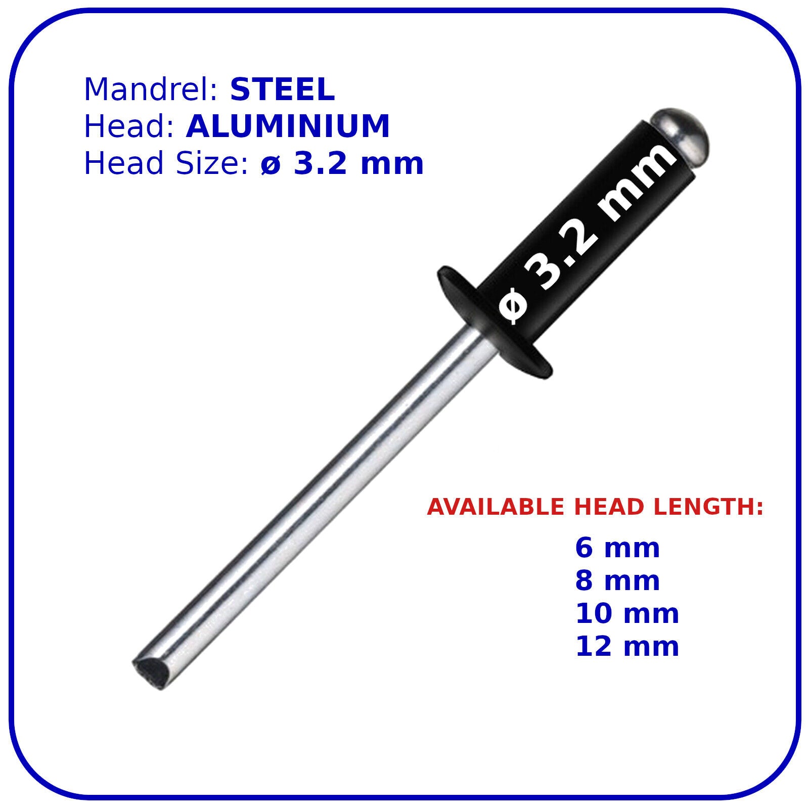 Pop Rivets BLACK 3.2 mm Aluminium Head Steel Mandrel Dome Blind Rivet Coloured