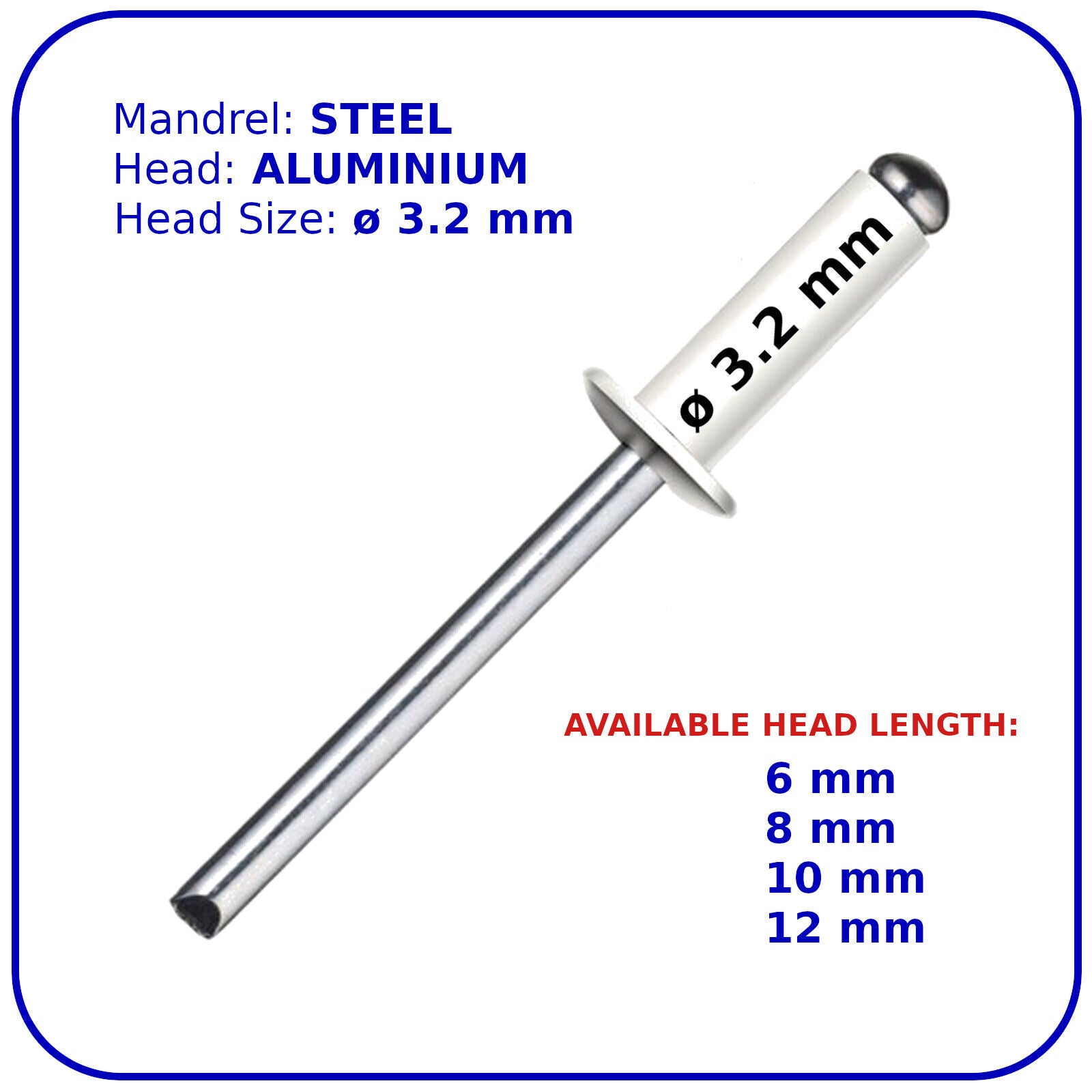 Pop Rivets WHITE 3.2 mm Aluminium Head Steel Mandrel Dome Blind Rivet Coloured